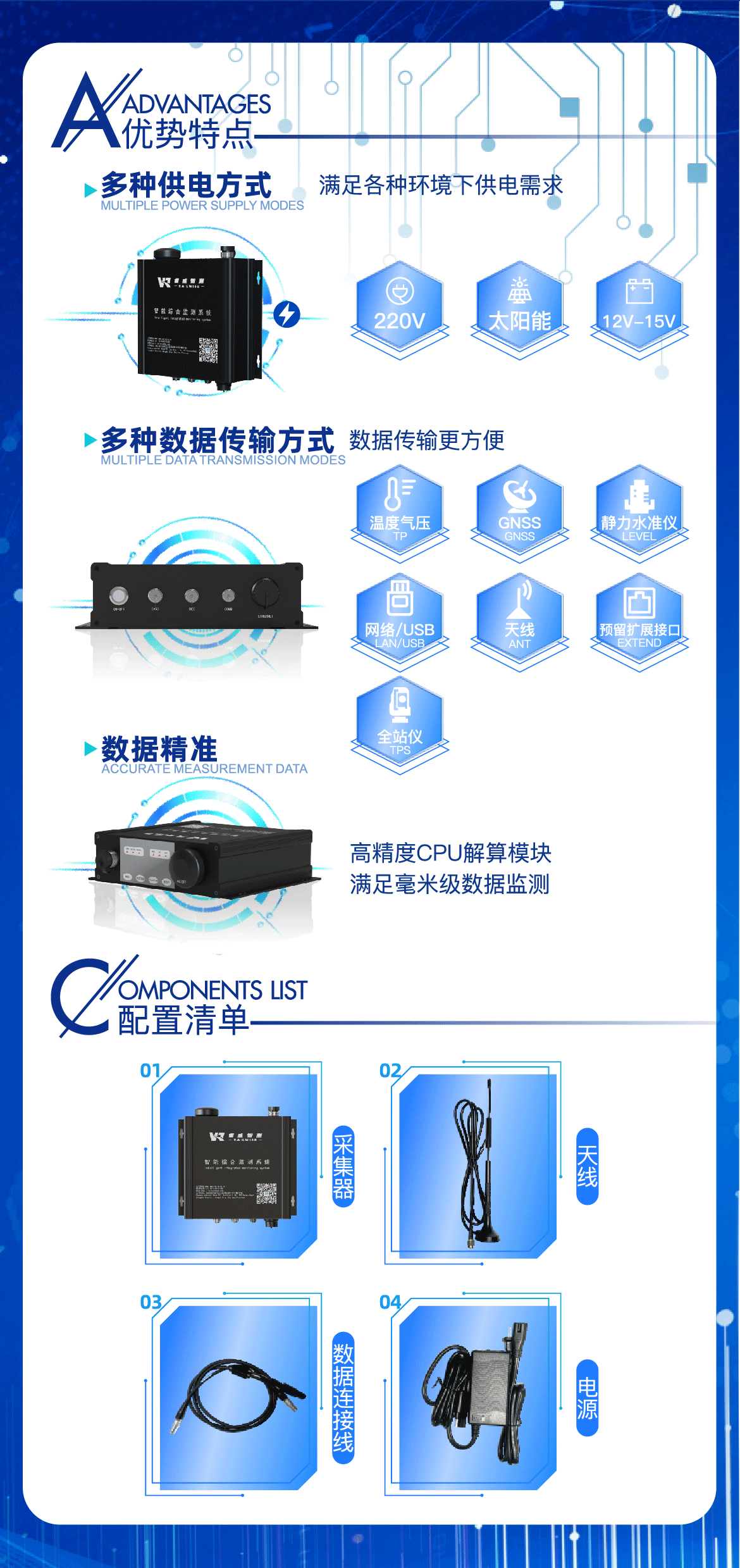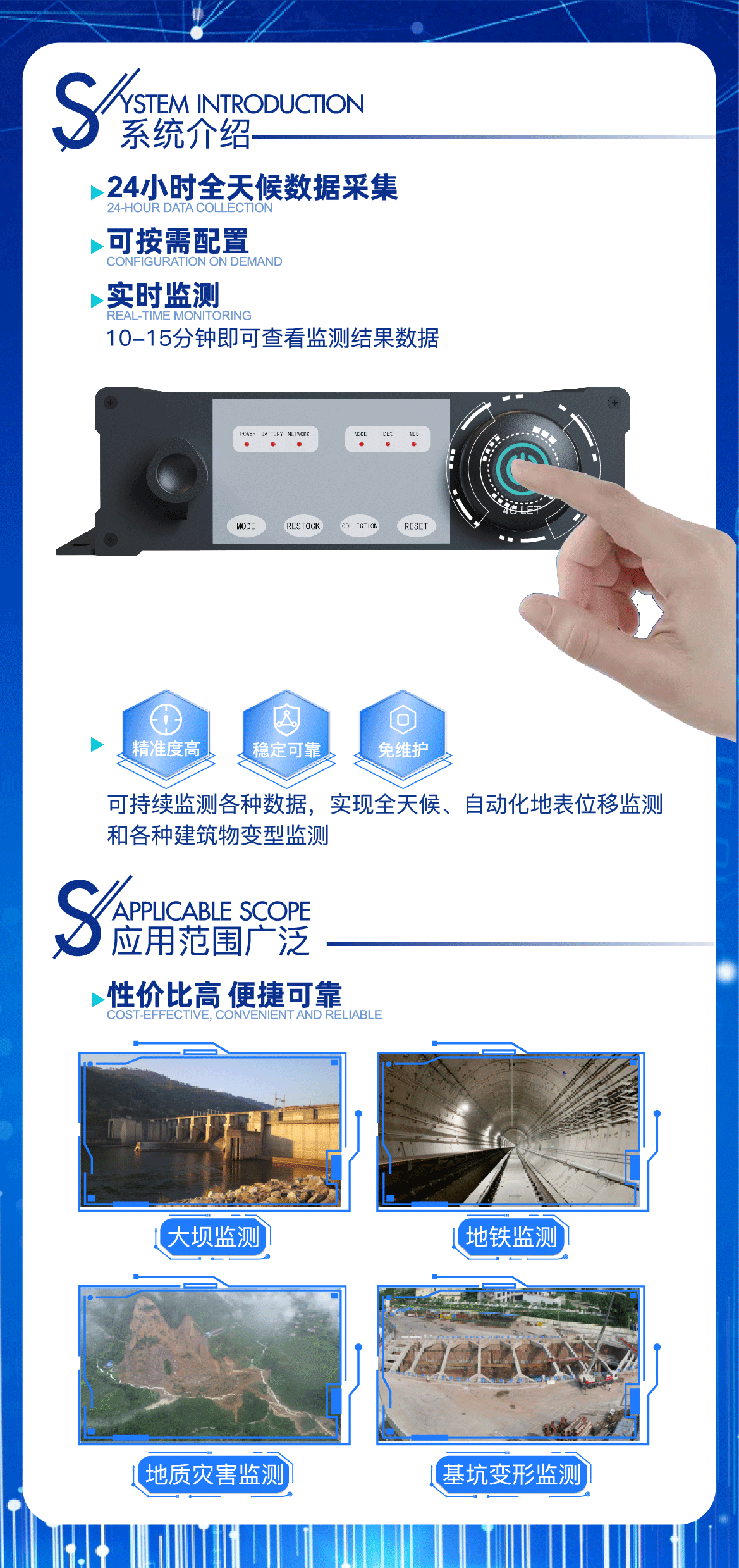 该系统专为取代高风险、高成本、低时效的人工现场观测而设计,适用于大坝、桥梁、基坑、隧道、滑坡及高层建筑等关键基础设施的安全监测。